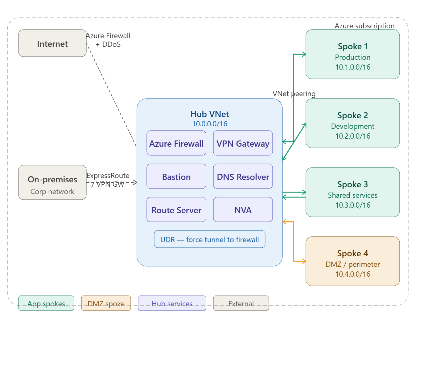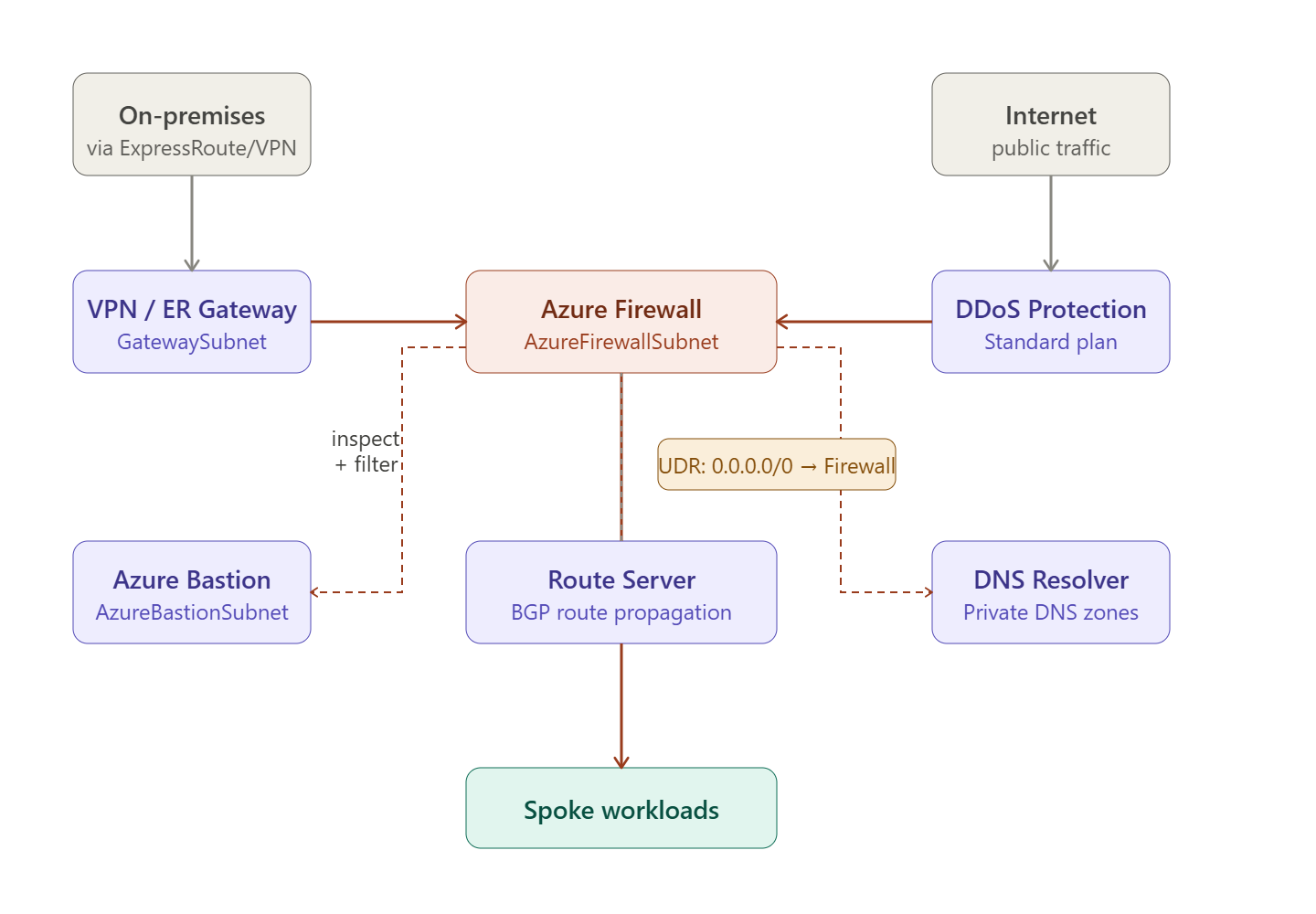 Spoke VM → UDR (0.0.0.0/0 → Firewall IP) ↓ Azure Firewall (inspect, allow/deny) ↓ Destination (internet / on-prem / other spoke)