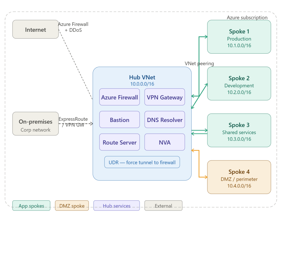 Hub and spoke is the recommended enterprise network topology for Azure. Instead of each team or workload managing its own connectivity and security, all shared services live in one central hub VNet, and workloads live in isolated spoke VNets peered to it.