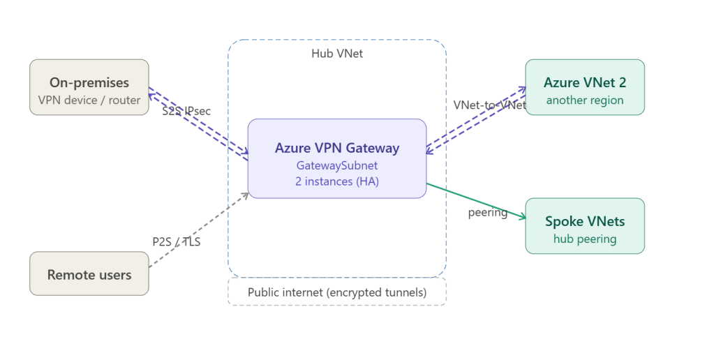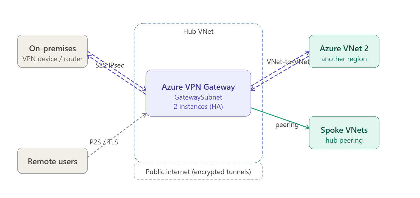 On-premises VPN device ↓ IPsec/IKE tunnel (encrypted)Azure VPN Gateway (2 VM instances in GatewaySubnet) ↓ internal routingHub VNet → UDR propagation → Spoke VNets