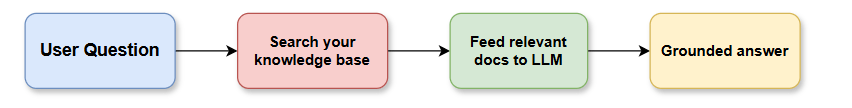 User Question → Search your knowledge base → Feed relevant docs to LLM → Grounded Answer